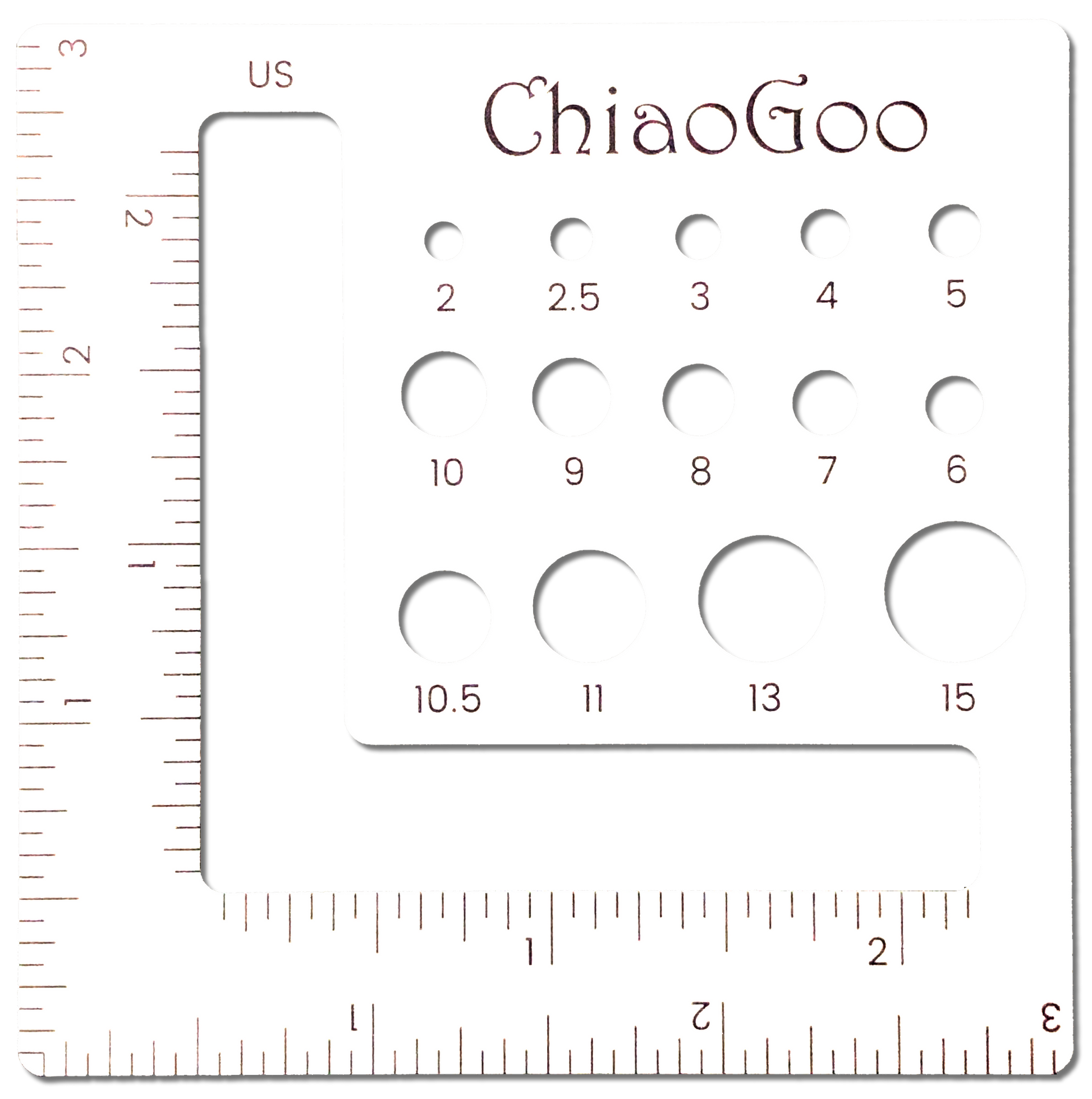 The ChiaoGoo Swatch/Needle Gauge made of sturdy white resin. It is a multi-purpose tool used to help determine gauge and measure your needle/hook sizes. Simply place the tool on your swatch and count how many stitches/rows fit inside the cut outs (along the bottom for stitch gauge and up the side for row gauge).